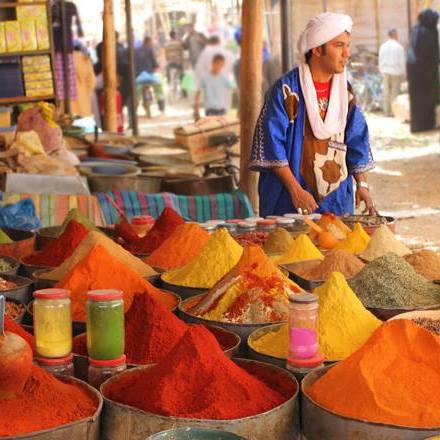 El sabor de la cúrcuma, cominos, jengibre, azafrán y canela entre otros. El color de los turbantes, chilabas y kaftanes. El olor del agua de rosas, amizcles y aceites. El té servido con tradición y símbolo de la hospitalidad marroquí.